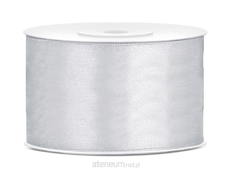 Tasiemka satynowa w kolorze srebrnym, szerokość 38 milimetrów, długość 25 metrów.