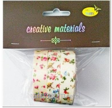 Taśmy materiałowe samoprzylepne 3 szt. miks wzorów. . Zestaw 3 ozdobnych taśm materiałowych samoprzylepnych długości 4 mb. Taśmy dają się odkleić od podłoża bez niszczenia go.