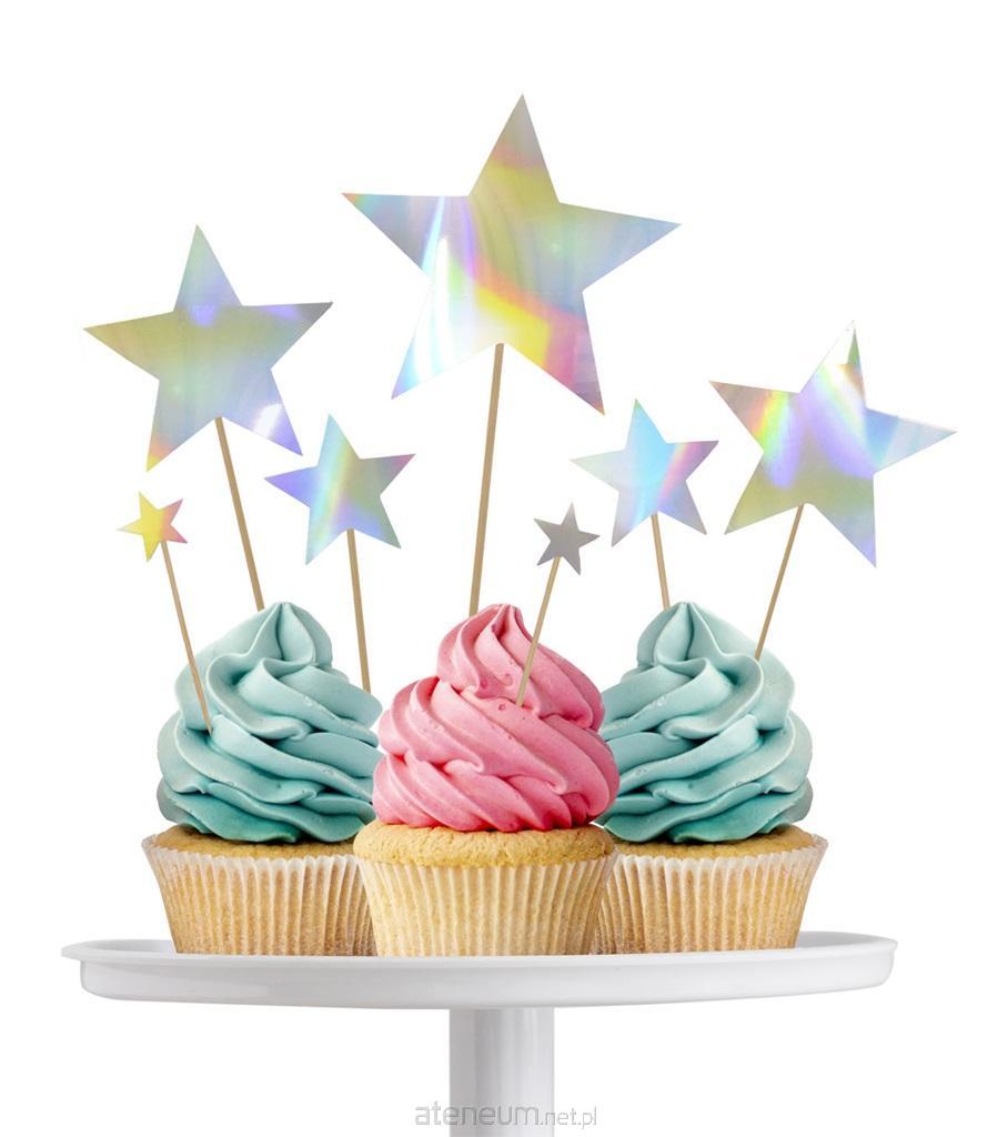 Drewniane patyczki z papierową opalizującą gwiazdką. Idealne do dekoracji tortu czy babeczek. Opakowanie zawiera 7 sztuk. Rozmiar: 6 - 14,5 cm.