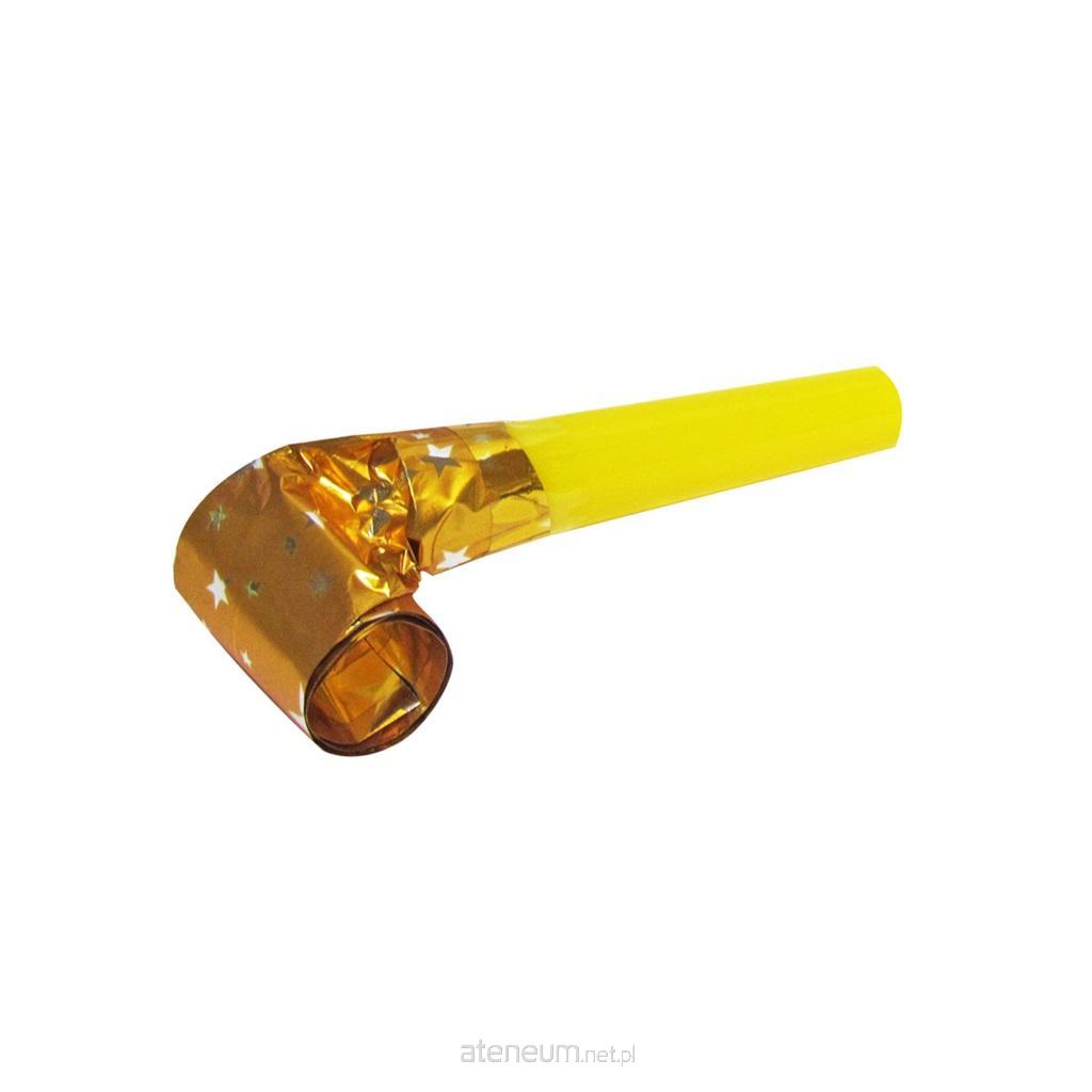 Imprezowe gwizdki, trąbki wykonane z mieniącego się, złotego materiału w gwiazdki. Zakończone plastikowym ustnikiem. Zabawny gadżet na każdą imprezę, do uczczenia solenizanta lub witania Nowego Roku. Gwizdki o długości 35 cm po całkowitym rozciągnięciu oraz o szerokości 2,5 cm. W opakowaniu znajdują się 4 sztuki.