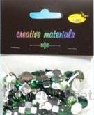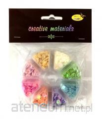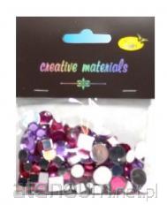 Kryształki z płaskim spodem wykonane z przezroczystego tworzywa sztucznego w kształcie kolistym. Spód srebrny metalizowany. Opakowanie z eurozawieszką zawiera miks elementów wielkości 4 mm w 12 różnych kolorach umieszczone w plastikowym pojemniku z 12 przegródkami.