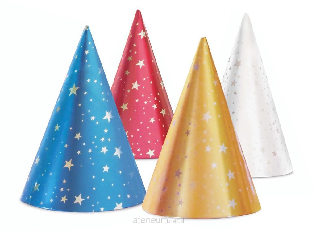 Metaliczne papierowe czapeczki imprezowe w gwiazdki. Uniwersalne czapeczki, doskonały dodatek każdej imprezy okolicznościowej, urodzin, przyjęć noworocznych i zabaw dla dzieci. Elastyczna gumka zapewnia stabilne i komfortowe utrzymanie się czapeczki na głowie. Wysokość czapki: 16 cm. W opakowaniu znajdują się 4 sztuki.