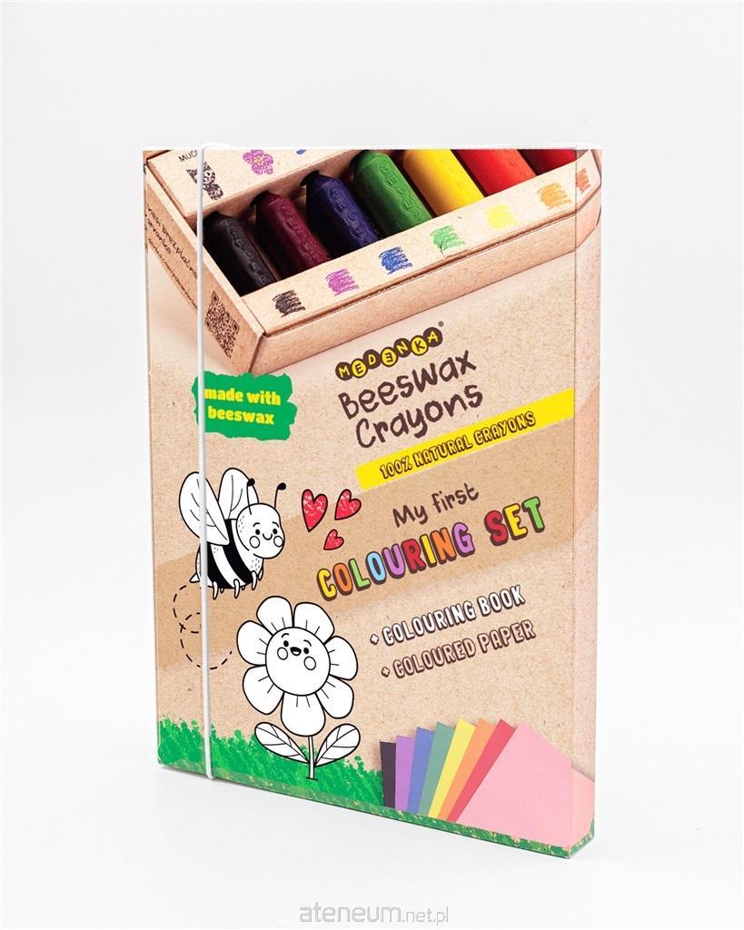 6 kolorowych grubych kredek z czystego wosku pszczelego, których kształt jest specjalnie dostosowany dla dzieci od 1 roku życia