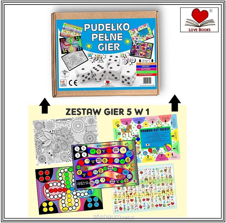 Zestaw 5 gier w 1 Pudełko zawiera następujące plansze do gier: Giga Memo do wycinania i zabawy Chińczyk Antystresowa gra rodzinna Kot pierwszy? Prawda czy Fałsz? Pudełko w formacie 32x45 x 3 cm, dodatkowo zabezpieczone folią. W zestawie dodatkowo kostka do gry, mini pionki oraz dodatki. Wspaniała zabawa dla całej rodziny.