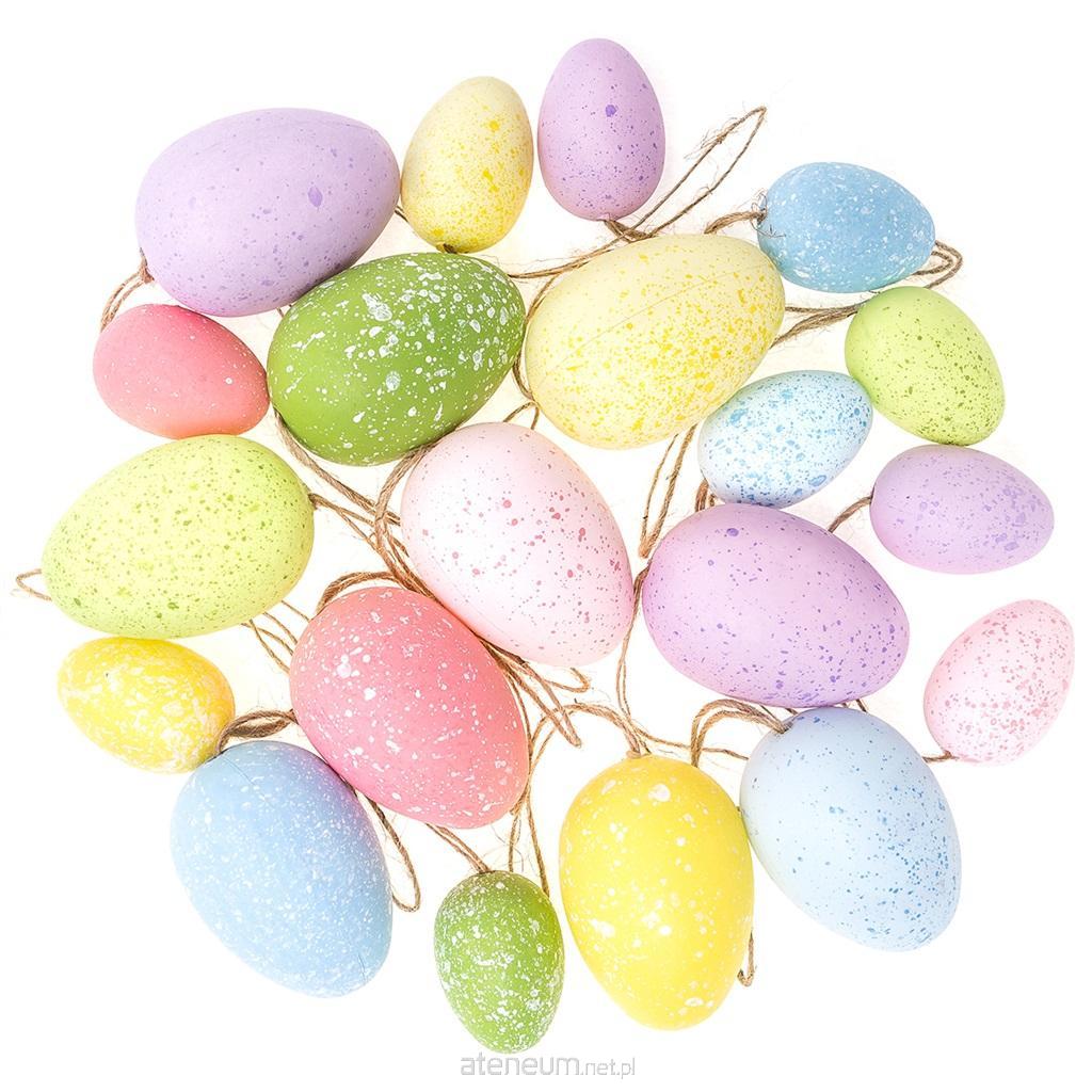 Delikatnie nakrapiane jajka z zawieszką, w pastelowych kolorach.
