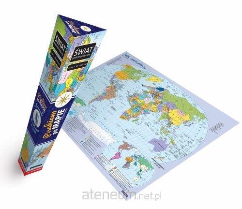 Świat - polityczna mapa ścienna w skali 1 : 60 000 000. Główną treścią tej mapy jest podział polityczny współczesnego świata. Dlatego obszary państw i terytoriów zależnych są wyróznione różnymi kolorami. Obszary te są czytelnie podpisane, a ich stolice wyraźnie wskazane. Ważnym uzupełnieniem są dwie mapy w mniejszych skalach: obrazujące sojusze gospodarcze i polityczne we współczesnym świecie. Na odwrocie znajduje się kolorowa mapa konturowa, na której można się sprawdzić (z zapamiętania podstawowych informacji) dodając podpisy państw, stolic, rzek, mórz itd. wykorzystując dołączonego do zestawu pisaka suchościeralny.