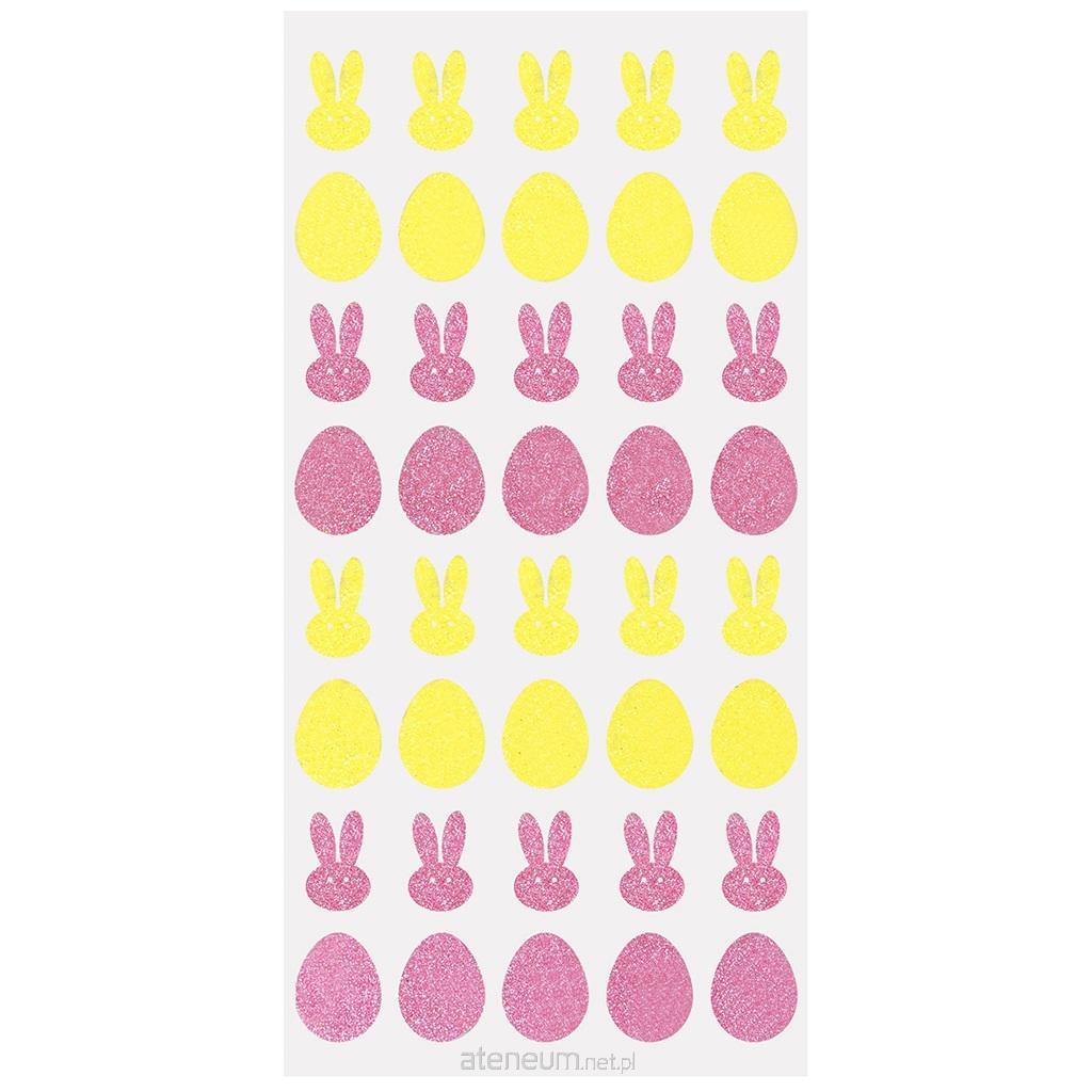 Piankowe naklejki brokatowe w kształcie zajączków i jajeczek. Idealne do dekoracji wielkanocnych, kartek świątecznych, prac szkolnych. Naklejki na blistrze o wymiarze 27x15 cm.