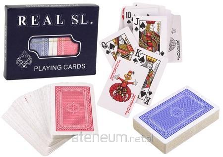 Karty Do Gry Real Sl Dwie Talie Klasyczna talia kart w formacie 56x 87 mm, wykonana z kartonu karcianego z wkładką węglową, pokryta lakierem karcianym , który zapewnia ich wyjątkowy poślizg i zmniejsza absorpcję wilgoci. Zestaw posiada dwie talie kart. Wymiary opakowania: 11,5cm x 9 cm x 1,5cm Posiada certyfikat CE. Przeznaczony dla dzieci powyżej 3 roku życia.
