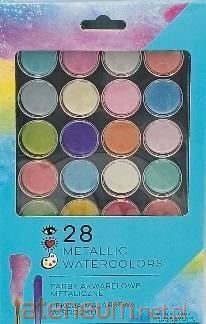 Odkryj nieograniczone możliwości zabawy kolorami i twórz własne, oryginalne obrazy. Wygodny, kompaktowy zestaw 28 farb akwarelowych w pięknych, metalicznych odcieniach każdemu użytkownikowi pozwoli wyrazić swoją kreatywność. Komplet zamknięty jest w plastikowym etui chroniącym farby przed wysychaniem i ułatwiającym ich codzienne użytkowanie. Do zestawu dołączony został pędzelek oraz krótki przewodnik po technikach akwarelowych. Dzięki niemu każdy nauczy się łączyć kolory i tworzyć nowe odcienie. Jest to idealny prezent dla dzieci, przyjaciół, dla wszystkich lubiących malować.