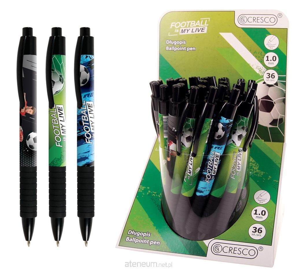 Długopis SERIA FOOTBALL LIVE nowość CRESCO. Ponadczasowe wzornictwo długopisu czyni go wyjątkowym i uniwersalnym dla każdego. Wykonany został z plastiku, uchwyt natomiast jest softowo-gumowy. Mechanizm włączania pstrykany, wkład typu X22, grubość linii pisania 1mm. W opakowaniu zbiorczym 36 szt - mix 3 wzorów.