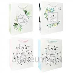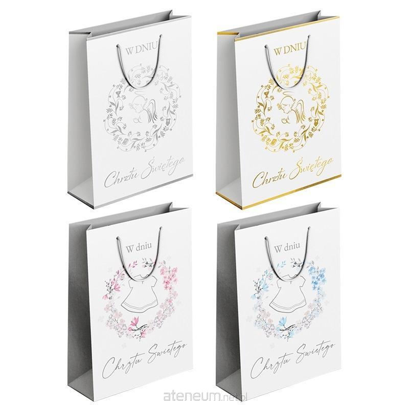 Torby prezentowe bogato ozdobione srebrną lub złotą folią. Gruby papier o dużej sztywności gramatura 210 g/m. Miks 4 wzorów wysyłanych losowo.