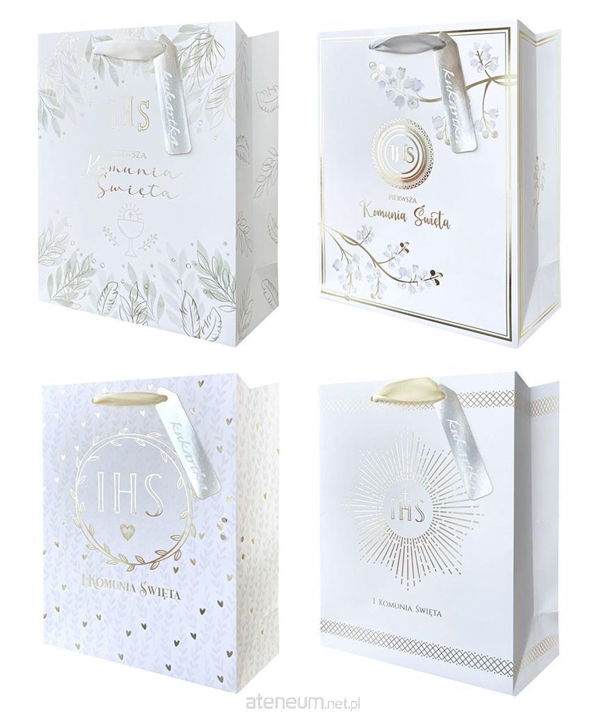 Oprócz świetnej jakości serii Q, wyróżniają się różnymi zdobieniami, ozdobną zawieszką oraz rączką z satynowej tasiemki. Są piękne, solidnie wykonane, w takiej torbie każdy prezent będzie prezentować się elegancko. Cechy szczególne: typ produktu: torba na prezent, zdobienie: metaliczna folia wielkość orientacyjna: 42 x 30 x 12cm (wysokość x szerokość x głębokość), okazja: Komunia