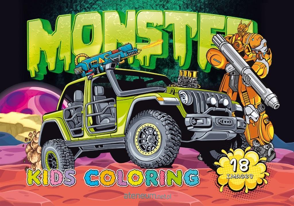 Kolorowanka dla dzieci. Na każdym z 18 obrazków znajduje się obrazek z monster truckiem, który tylko czeka żeby nabrać kolorów. Wyprodukowana na Ukrainie.