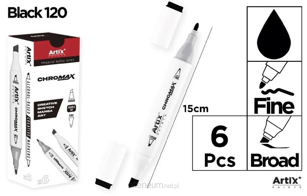 Kreatywny marker Chromax z serii Artix z podwójną końcówką i tuszem na bazie alkoholu. Plastikowy korpus. 1 mm cienka końcówka i 2-5 mm końcówka ścięta do precyzyjnych linii. Idealny do tworzenia kreatywnych rysunków, szkiców, mangi, komiksów i wszelkich kreacji piórem. Doskonały dla artystów hobbystów, projektantów i do wszelkich kreatywnych zastosowań. Szeroka gama kolorów do stworzenia dowolnego projektu. Pudełko zawiera 6 sztuk. Dostępny w 120 intensywnych kolorach.
