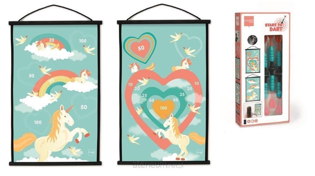 START TO DART _Jednorożec - dwustronna tarcza z rzutkami z motywem Jednorożca. START TO DART - to bezpieczna zabawa dla młodszych wielbicieli rzutek. Gra polega na jak najbardziej precyzyjnym trafieniu rzutkami w tarczę, gdzie rozmieszczono punkty za każdy oddany rzut. Tarcza jest dwustronna co pozwala na zabawę na dwa różne sposoby. Do tarczy dołączono 6 sztuk bezpiecznych rzutek z gumową przyssawką. Dzięki temu rzutki mają odpowiednie wykończenie bezpieczne dla młodszych dzieci, które rozpoczynają zabawę w popularną grę w dart. Dart to znana i lubiana gra, która rozwija zręczność i koordynację ruchowo-wzrokową u dzieci.