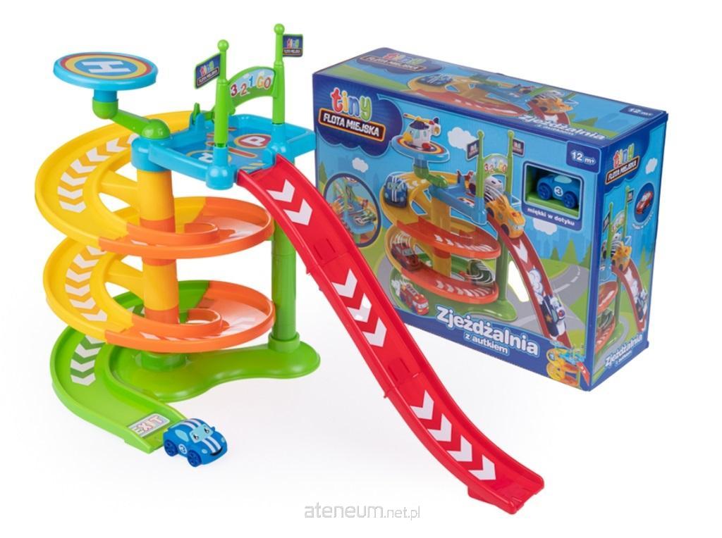 Rozpędź się do kolorowej zabawy, zjeżdżając zakręconym torem w dół! Ten duży zestaw elementów pozwala na zbudowanie zjeżdżalni o wysokości 37 cm. Poza torem do zjazdu, znajdziemy tu kilka dodatkowych elementów, które urozmaicą zabawę: ruchomy szlaban, miejsce parkingowe, oraz znajdujące się na szczycie zabawki, lądowisko. Do zestawu dołączony jest jeden, miękki w dotyku mini samochodzik. Zabawkę można rozbudować, dokupując oddzielnie inne produkty z serii Flota Miejska Tiny, Lawetę z autkiem oraz pojedyncze Pojazdy Mini, które występują w aż 8 różnych wzorach. W serii znajduje się także zabawka dla starszych dzieci, Garaż Deluxe