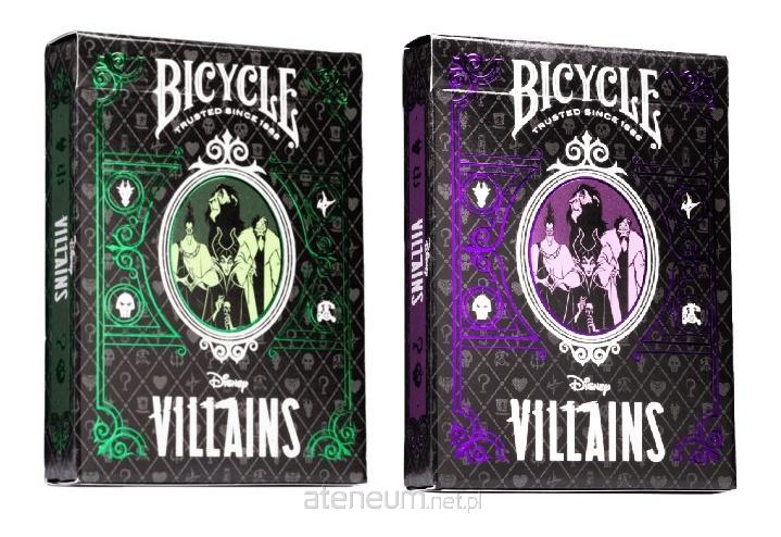 Karty do gry Disney Villains z naszej kolekcji Disney przedstawiają czterech znanych złoczyńców Disneya z przodu, ze srebrnymi i zielonymi lub fioletowymi akcentami foliowymi na etui. Na awersach kart znajdują się karty dworskie z grafiką 12 różnych złoczyńców Disneya.