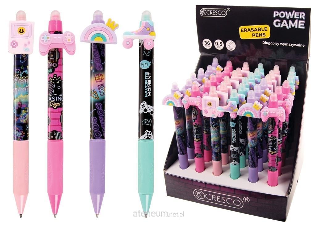 Długopis wymazywalny CRESCO o grafice z elementami POWER GAME. Pstrykany system wysuwania niebieskiego wkładu o linii pisania 0,5mm. Softowy, profilowany trójkątny uchwyt.