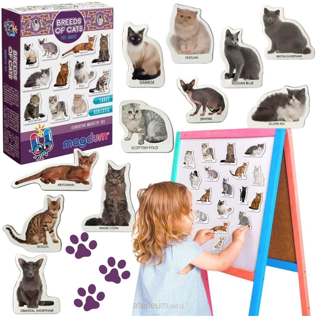 Dzięki magnesom maluch z łatwością odróżni różnorodne gatunki kotów oraz nauczy się, jakie cechy posiada każde z nich. Zabawa zestawem doskonale sprawdza się do poszerzania wiedzy. Wszystkie rasy kotków są podpisane pod zdjęciami!