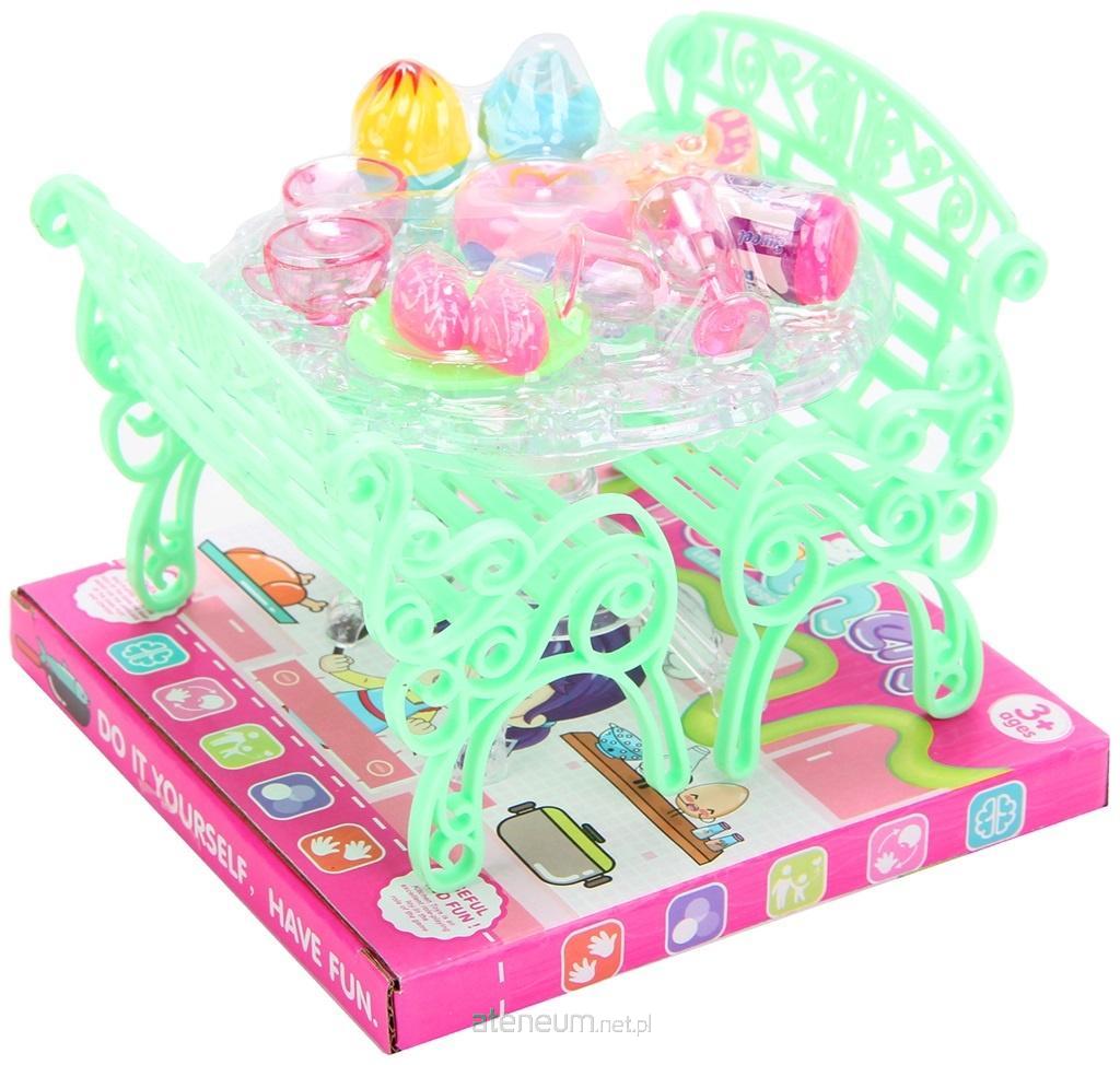 Stolik z ławkami oraz akcesoriami dla lalek.