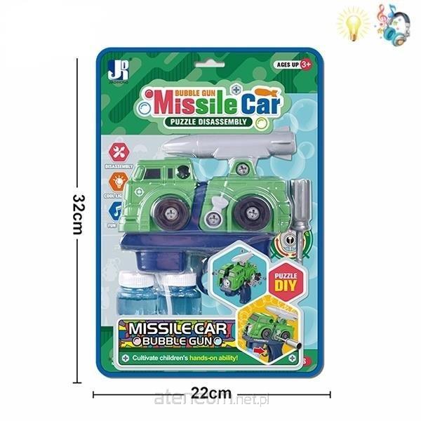 Elektryczny pistolet na bańki Pojazd Wojskowy. Elementy pistoletu można rozkręcić za pomocą dołączonego do zestawu śrubokrętu. Pistolet oświetla wypuszczone bańki światłem LED oraz gra przyjemne melodie. Posiada system uniemożliwiający wylanie się płynu. Zestaw zawiera: pistolet z rozkręcaną obudową, śrubokręt, 2 butelki płynu do baniek. Pistolet jest zasilany bateriami 2xA nie zawartymi w zestawie.
