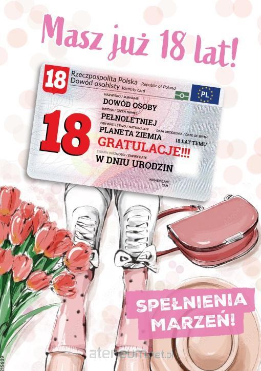Karnet okolicznościowy na 18 urodziny z kopertą i tekstem wewnątrz i miejscem na osobiste życzenia.