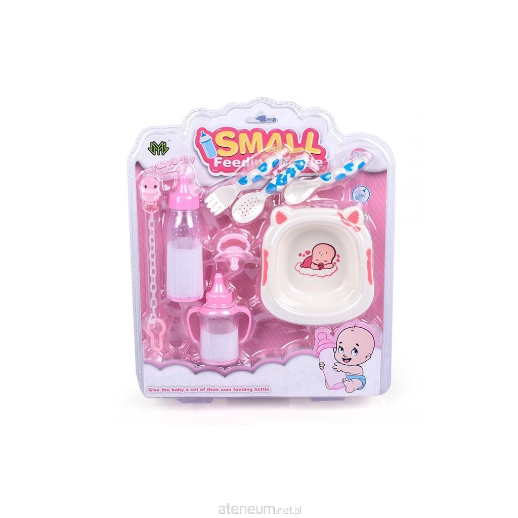 Zestaw akcesoriów dla lalek 8 el. - Butelki, smoczek z łańcuszkiem zestaw sztućców i talerzyk.