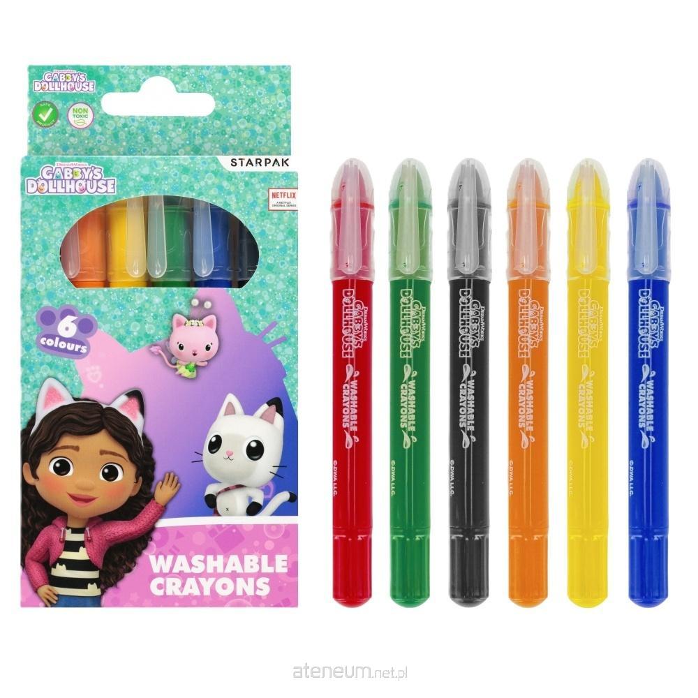 Kredki zmywalne Koci Domek Gabi 6 kolorów STARPAK. Kredki o intensywnych kolorach, zmywalne za pomocą wody. Kredki są bezpieczne i wygodne w trzymaniu a dzięki plastikowej oprawie nie brudzą. Każda kredka zamykana jest zatyczką co chroni przed jej uszkodzeniem oraz przed zabrudzeniem wszelkiej powierzchni po odłożeniu kredki a także opakowania w którym dziecko przechowuje kredki.
