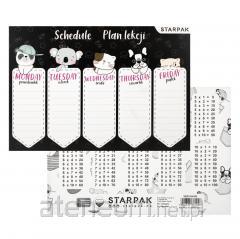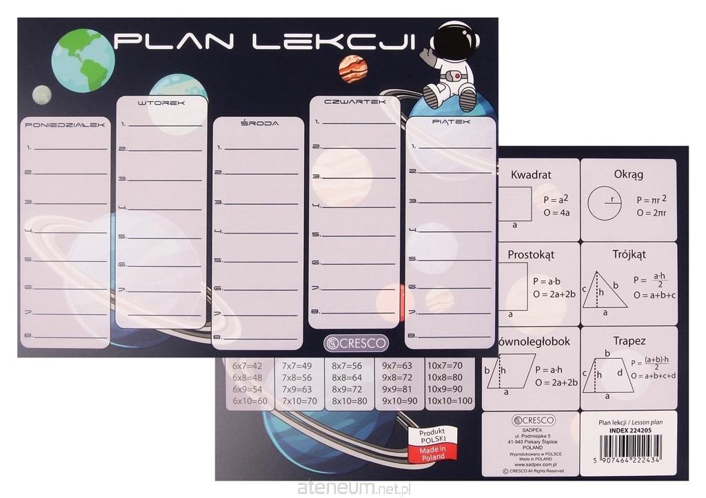 Plan lekcji dla ucznia o ciekawej grafice w formacie A5. Zawiera miejsce do samodzielnego uzupełnienia na pięć dni zajęć szkolnych. Z tyłu tabliczka mnożenia oraz podstawowe wzory matematyczne. Zapakowany w opakowanie zbiorcze - folię po 25szt.