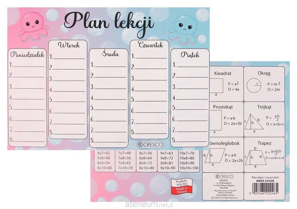 Plan lekcji dla ucznia o ciekawej grafice w formacie A5. Zawiera miejsce do samodzielnego uzupełnienia na pięć dni zajęć szkolnych. Z tyłu tabliczka mnożenia oraz podstawowe wzory matematyczne. Zapakowany w opakowanie zbiorcze - folię po 25szt.