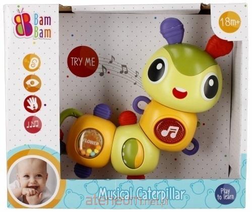 Interaktywna Muzyczna GĄSIENICA, zabawka spełniająca funkcję- grzechotki, gryzaka oraz pozytywki, na każdy etap rozwoju dziecka. Zróżnicowana faktura i materiały, w tym ruchome elementy oraz mrugające przyciski, wygrywające melodie oraz odgłosy radosnego dziecka ,dostarczają szeregu bodźców, aktywizując wszechstronny rozwój dziecka, począwszy od zmysłów poprzez zdolności manualne, motoryczne oraz percepcję i wyobraźnię. Czułki Gąsienicy oraz nóżki pełnią rolę gryzaka, przynosząc ulgę dziecku w trudnym okresie ząbkowania. Gąsienica posiada trzy obracane części tułowia, na każdym umieszczone inne dodatki,1- przycisk z melodyjkami oraz gaworzeniem i śmiechem dziecka, 2- obracająca się wewnątrz niewielka kulkami 3- z kilkoma małymi kuleczkami umieszczonymi za przezroczystą plastikową szybką .Wymiary/waga/baterie: wymiary produktu (dł. x wys. x gł.)[cm]: 15x19x6, wymiary opakowania (dł. x wys. x gł.)[cm]: 17x20x7, waga produktu bez opakowania [kg]: 0,14 kg, waga produktu w opakowaniu [kg]: 0,24 kg. Zabawka przeznaczona dla dzieci w wieku: 18M+. Wymaga zasilania bateriami 2x AAALR03- załączone do zestawu. Zestaw pakowany w kartonik z okienkiem.