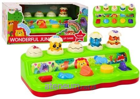 Zabawka Pop Up Wyskakujące Zwierzątka Panel Edukacyjny Dla Dzieci Dźwięki Ta kolorowa i interaktywna gra Pop Up to wspaniała zabawka, która zachwyci każde dziecko. Zabawka składa się z pięciu ponumerowanych jajeczek, z unikalnymi wzorami na każdym z nich. Pod każdym jajeczkiem znajduje się przycisk, który po naciśnięciu, przesunięciu lub przekręceniu sprawia, że z jajka wyskakuje jedno z pięciu uroczych zwierzątek: hipopotam, miś panda, lew, słoń i lisek. Każdy przycisk jest w innym kolorze, co pomaga w nauce rozpoznawania kolorów. Przyciski należy przesunąć, przeciągnąć lub przekręcić. Ta interaktywna zabawa nie tylko stymuluje zmysły, ale również rozwija umiejętności poznawcze poprzez zachęcanie do spostrzegawczości i koncentracji. Po zakończeniu jednej rundy zabawy, wystarczy zamknąć klapki z zwierzakami, aby rozpocząć nową sesję odkrywania. Ta funkcja zapewnia stałą rozrywkę i zachęca dzieci do powtarzania działań oraz uczenia się poprzez powtarzanie. Panel w swojej podstawie ma schowaną, rozkładaną rączkę transportową, dzięki czemu dziecko będzie mogło bez problemu transportować zabawkę. Dodatkowo zabawka wyposażona jest w dźwięki, które dodają jeszcze więcej radości do zabawy. Na obudowie znajdują się dwa przyciski regulujące poziom dźwięków: stopień pierwszy i drugi, oraz włącznik. Panel dźwiękowy oferuje różnorodne dźwięki, wesołą muzykę dla dzieci oraz odgłosy zwierzątek, co stymuluje rozwój zmysłów dziecka. Cała zabawka jest bardzo kolorowa, co przyciąga uwagę i zachęca do interakcji. To idealny sposób na rozwijanie umiejętności motorycznych, rozpoznawania kształtów i kolorów, a także naukę koordynacji ręka-oko, dostarczając przy tym mnóstwo radości i zabawy. Wymiary panelu: 32 cm x 16 cm x 10 cm Wymiary opakowania: 38 cm x 16 cm x 17 cm Zabawka zasilana jest trzema bateriami 1.5V AA, które nie są elementem zestawu. Posiada certyfikat CE, ponadto jest zgodny z normą EN71. Przeznaczony dla dzieci powyżej 12 miesiąca życia.