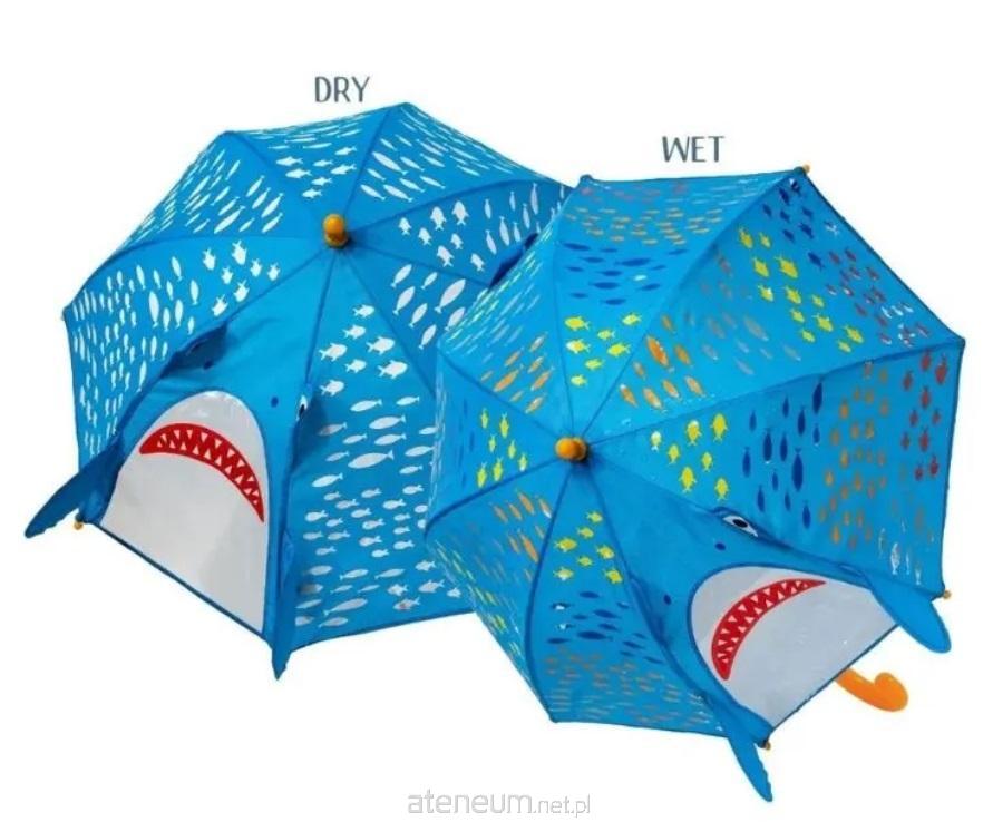 Niezwykła parasolka zmieniająca kolory, wyposażona w zabawne elementy 3D i okienko do wyglądania. Zmieniające się kolory parasolki sprawią, że dzieci będą uwielbiały spacery na deszczu. Czasza parasolki przedstawia rekina, którego buźka tworzy okienko pozwalające oglądać świat. W komplecie znajduje się wygodne zapięcie na rzep do zabezpieczenia złożonej parasolki. Cechy: