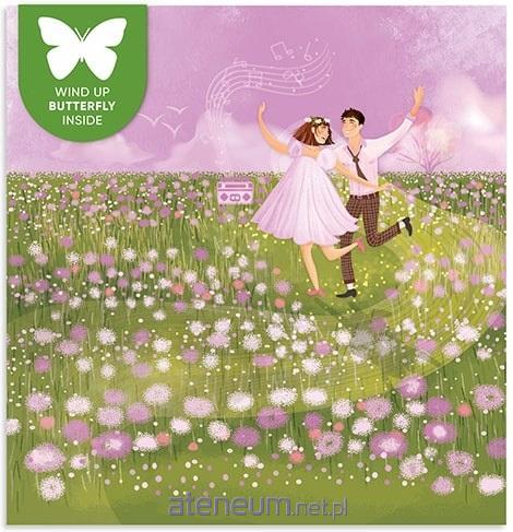 Karnet w formacie kwadratu (15x15cm) z niespodzianką. Po otwarciu karnetu wylatuje z niego papierowy motylek. Wspaniała niespodzianka dla osób poszukujących oryginalnego i efektownego prezentu. Do karnetu dołączona jest instrukcja obsługi. Wyprodukowany na Litwie.