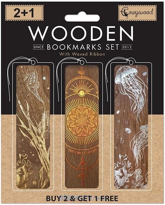Zestaw 3 drewnianych zakładek ze wstążką i obustronnym nadrukiem. Są w 100% biodegradowalne, wykonane przy użyciu minimalnego nakładu energii, gazu i wody. Wyprodukowane na Litwie.