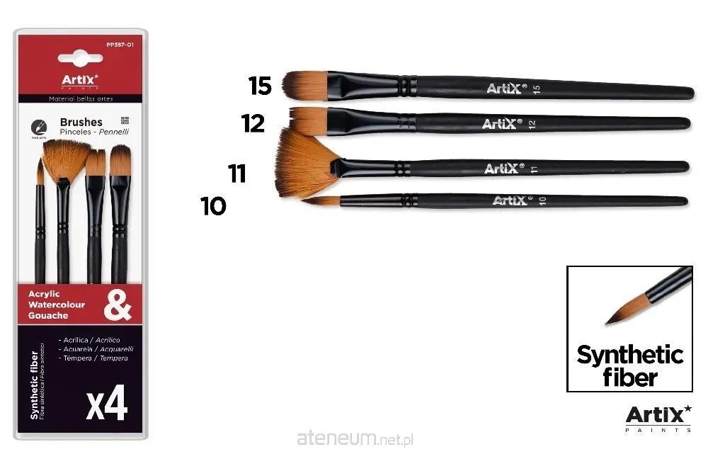Profesjonalny pędzel do malowania z bardzo miękkiego włosia syntetycznego. Idealny do farb temperowych,olejnych lub akrylowych. Drewniany korpus lakierowany na czarno. Długość: 20,5 cm. Blister zawierający 4 sztuki: trzy z płaskimi skuwkami(1 koci język nr 15, 1 płaski nr 12 i jeden płaski wentylator) oraz 1 okrągła skuwka nr 10.