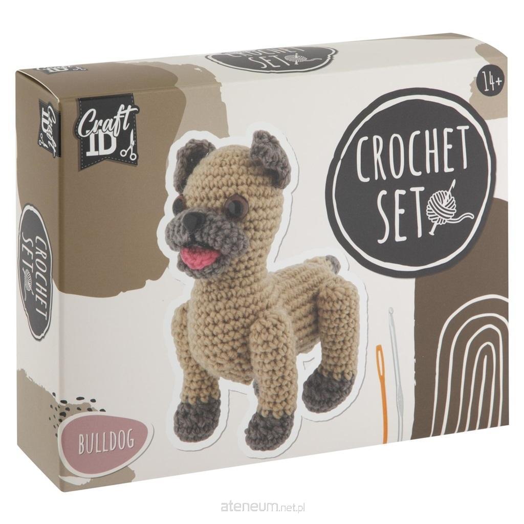 Zestaw do szydełkowania Buldog, 9,5x15,5x16 cm Zestaw zawiera: nić w dwóch odcieniach brązu, nić czerwoną, szydełko plastikowe + oczka dla pieska