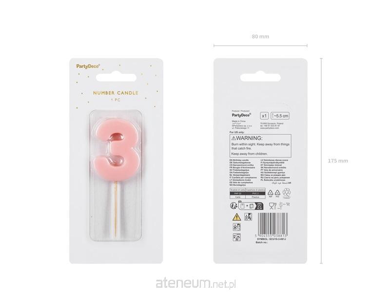 Świeczka urodzinowa Cyferka 3, w kolorze jasnoróżowym, rozmiar ok. 5.5 cm.