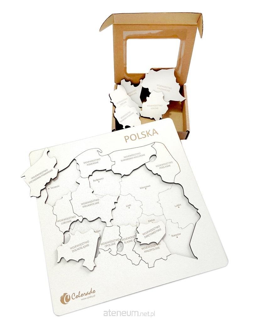 16 puzzli w kształcie województw z wygrawerowanymi ich nazwami.