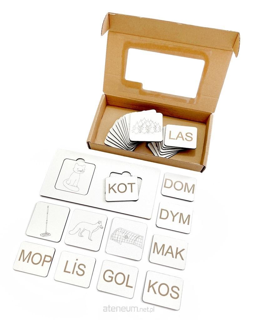 Ilość elementów: 31 elementów: 15 płytek z obrazkami (kot, lis, mak, dom, kok, mop, sól, dom, dym, kos, sum, bus, ul, las, gol), 15 płytek z sylabami zamkniętymi oraz podstawą bazową