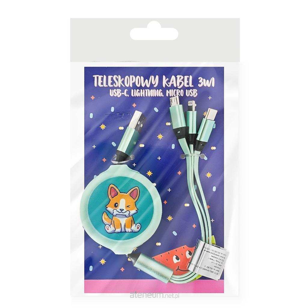 Produkt posiada 3 różne końcówki do ładowania oraz ponad metrowy, rozsuwany kabel co sprawia, że jest niezwykle użyteczny i uniwersalny. Kabelki do ładowania posiadają ciekawe kolory oraz grafikę. Długość kabelków po rozciągnięciu: 110 cm. Ładowanie: Micro/Lightning/Type C