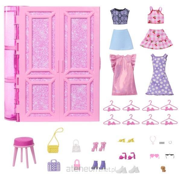 Zawartość: 1 szafa, 4 pełne stroje (ubranka Barbie), 8 wieszaków, 9 akcesoriów, 5 par bucików, 1 figurka pieska i 1 stołek.