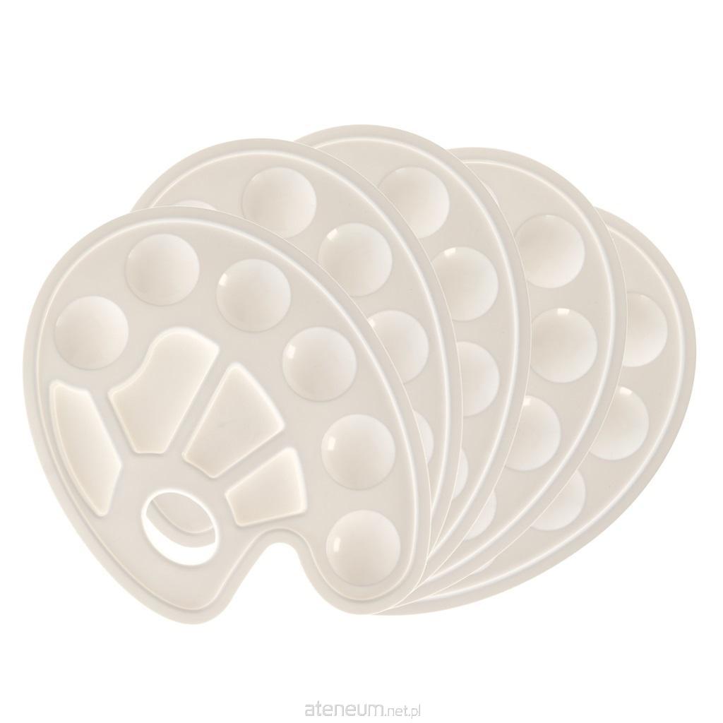 Paletka malarska w kolorze białym. Idealna do mieszania różnych kolorów farb. Posiada 10 wgłębień. Ergonomiczny kształt, gwarantuje wygodę podczas użytkowania. Łatwa w czyszczeniu. W zestawie 5 sztuk.