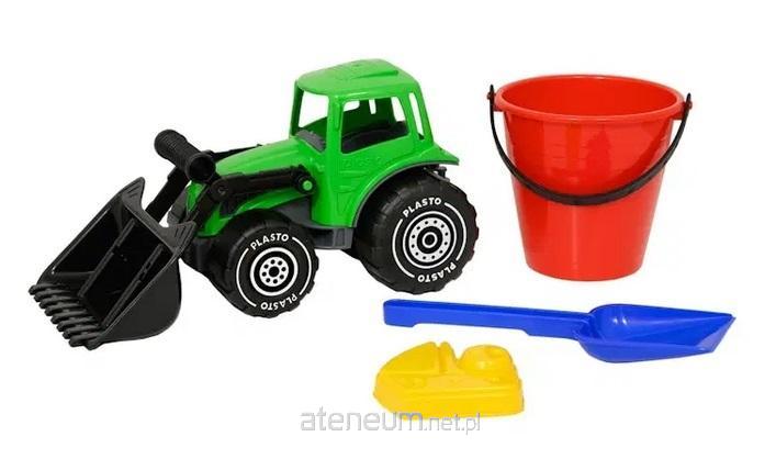 Ten zestaw dla dzieci Plasto z traktorem i zabawkami do piasku składa się z 4 części: Ciągnik, wiaderko, łopatka i foremka do piasku.