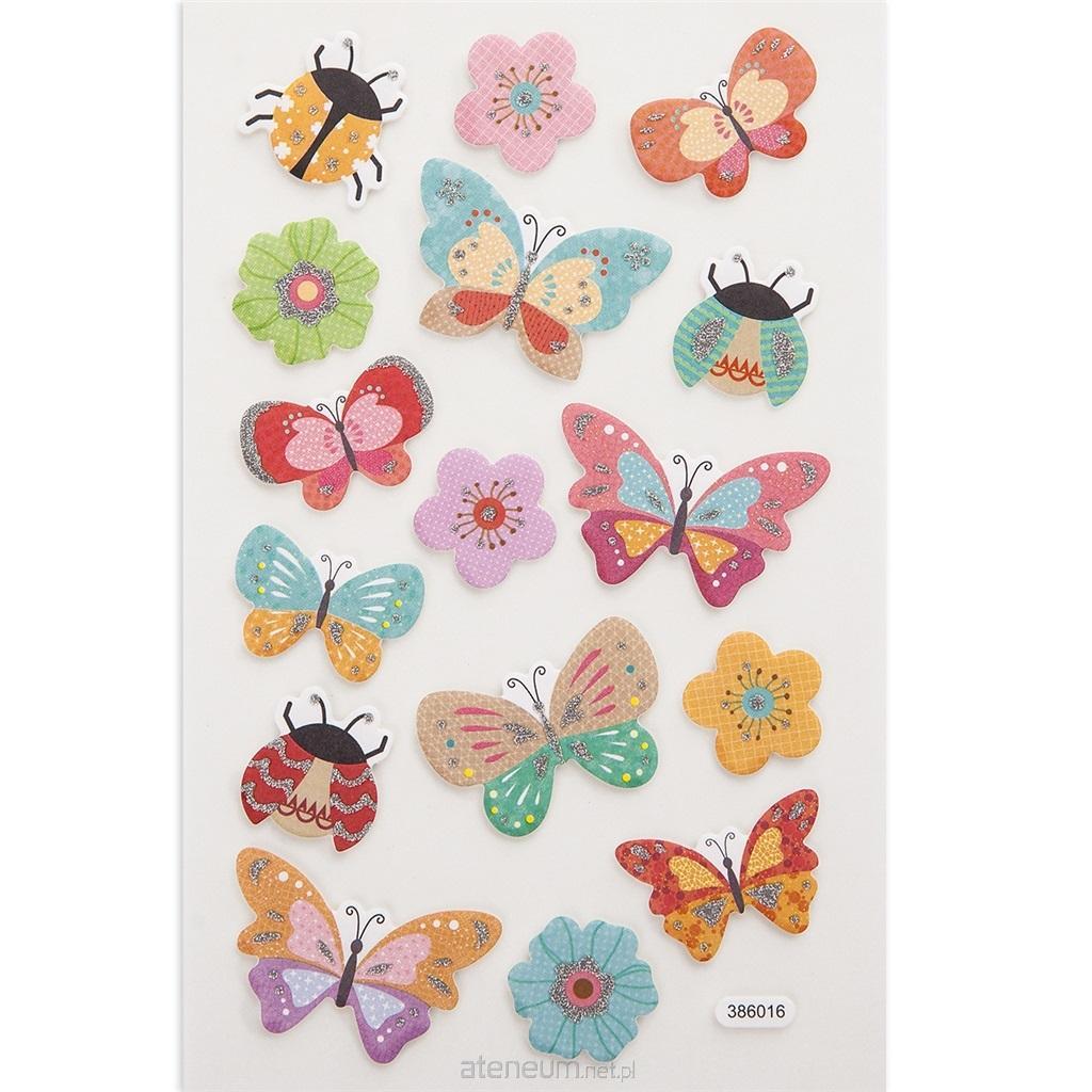 Naklejki z pianki zdobione brokatem z uniwersalnymi motywami motylków, robaczków i kwiatów.
