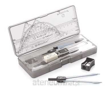 Zestaw geometryczny, 10 elementów: plastikowe etui, 2 ekierki, kątomierz, linijka, zestaw rysików, 2x cyrkiel, temperówka, gumka