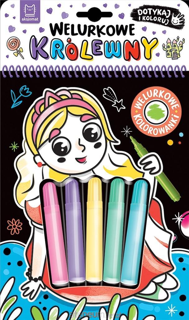 "Welurkowe królewny" to kolorowanka sensoryczna z dołączonymi pisakami. Tło obrazków pokrywa czarny welur, który podkreśla głębię kolorów, zapewnia wrażenia sensoryczne i ogranicza wychodzenie poza linię. Dzięki perforacji pokolorowaną pracę można oderwać, włożyć do ramki i podarować w prezencie lub ozdobić nią pokój. Książeczki z serii "Welurkowe kolorowanki":