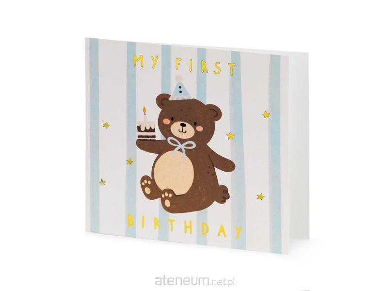 Kartka urodzinowa Miś, mix kolorów, wymiary 14x14 cm. Zestaw zawiera kartkę i kopertę.