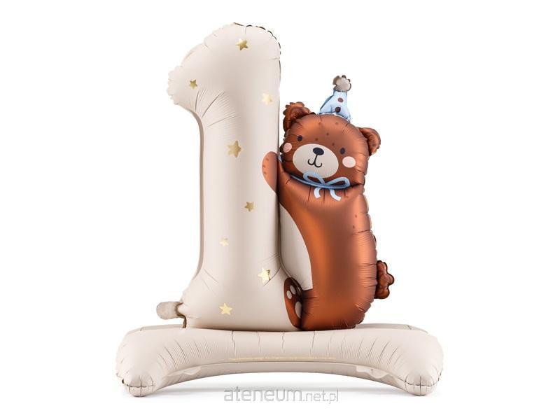 Balon foliowy w kształcie cyfry "1" z misiem, wym ok. 81 x 72 cm. Do napompowania powietrzem. Zestaw zawiera słomkę.