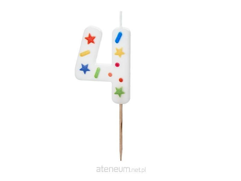 Świeczka urodzinowa Cyfra 4 w kolorze białym z konfetti na drewnianym patyczku, wysokość cyfry ok. 5.5 cm, wysokość całkowita ok. 10 cm.